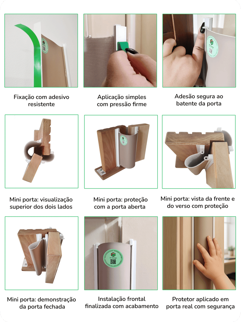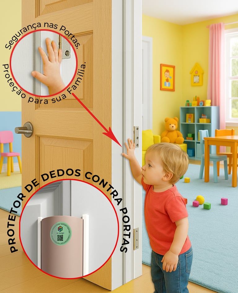 Dispositivo de segurança que evita o esmagamento de dedos no vão da porta. Ideal para escolas, creches, clínicas e residências.