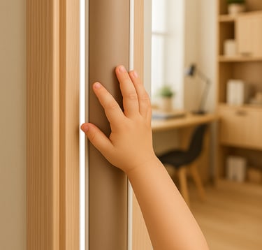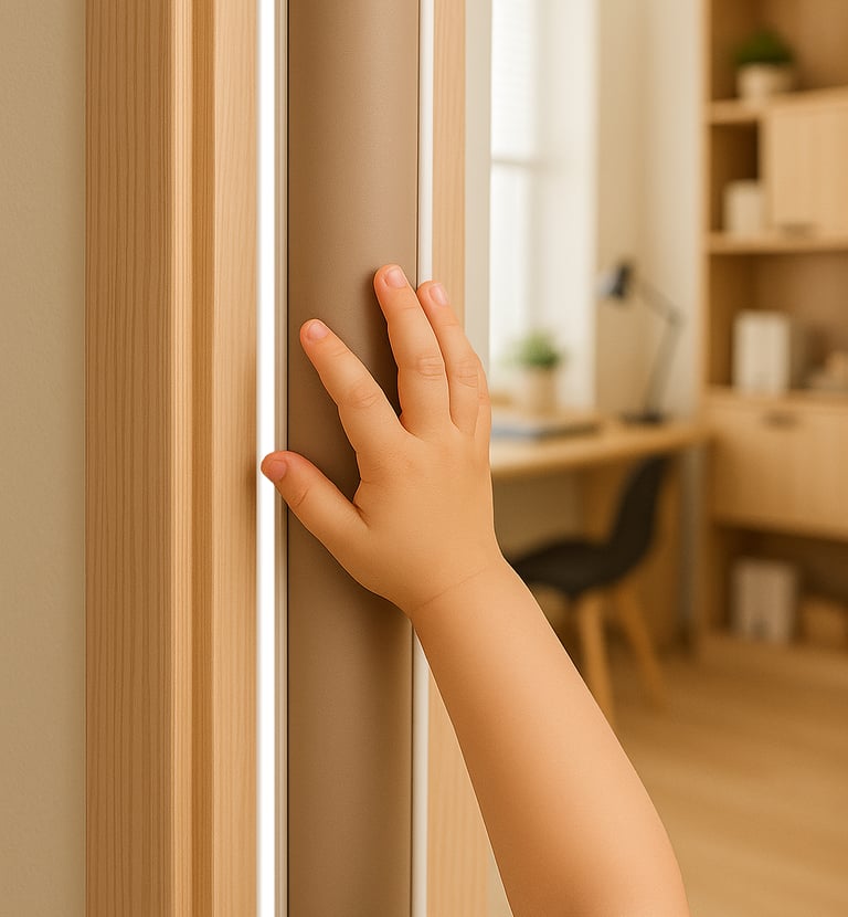 Acidentes com portas são rápidos, silenciosos e perigosos, especialmente para crianças pequenas. Com o uso de dispositivos de proteção, como a proteção contra esmagamento de dedos da YP Design, é possível: